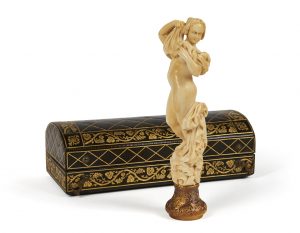 Petite statuette servant de sceau (initiales CH entremêlées), finement sculptée dans l’ivoire par Jean-Jacques Pradier, dit James Pradier et dont il existe des variantes en bronze intitulées Femme ôtant sa chemise.