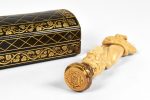 [HUGO, Victor].— DROUET, Juliette (1806-1883). PRADIER, Jean-Jacques (1790-1852) — Sceau surmonté d’une statuette d’ivoire — S.l., [vers 1825-1850 ?] — 15 cm de hauteur (dont 12,5 cm pour la sculpture), coffret oblong de maroquin à...