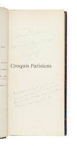 HUYSMANS, Joris-Karl (1848-1907) — Croquis parisiens — Paris, Léon Vanier, 1886 — In-12 (19 x 8,7 cm), demi-chagrin bleu nuit, dos à nerfs, pièce de titre rouge, tête dorée, couvertures conservées, chemise à dos de maroquin rouge, étui...