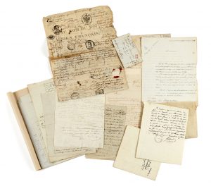 • Ensemble de feuillets manuscrits réunis dans une pochette portant l’inscription « 1er voyage en Orient, 1832 - Conventions avec la compagnie Fraissinet (capitaine Blanc) ». 29 p. dont plusieurs lettres adressées à Lamartine.