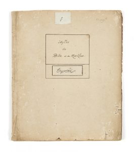 Manuscrit autographe de Leconte de Lisle intitulé Idylles de Biôn et de Moskhos, Tyrtées. Il correspond à son ouvrage de traductions d’auteurs grecs intitulé Hésiode, Hymnes orphiques… publié par Alphonse Lemerre en 1869.