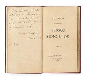 MARTÍ, José (1853-1895) — Versos Sencillos New York, Louise Weiss & Co, 1891 — In-12 (17,8 x 9,8 cm), maroquin rouge, étoile de maroquin crème mosaïquée au centre du premier plat, blason cubain doré au centre du second plat, dos à nerfs,...