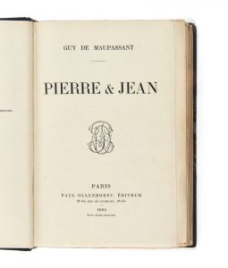 MAUPASSANT, Guy de (1850-1893) — Pierre et Jean — Paris, Paul Ollendroff, 1888 — In-12 (18,6x12,6), demi-maroquin bleu nuit à coins, double filet doré sur les plats, dos lisse orné (reliure de l’époque).