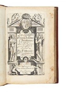 MOREAU, Pierre (?-1648) — Les Sainctes Prières de l’âme chrestienne — Paris, chez l’auteur, 1632 — In-12 (145 x 9,3 cm) de 113 ff., maroquin grenat, sur les plats vaste décor de motifs filigranés dorés sur fond de pièces de maroquin...