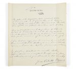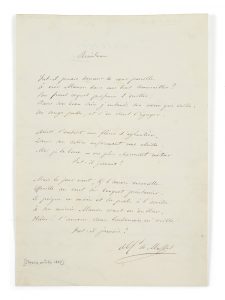 Poème autographe signé d’Alfred de Musset. Publié en 1843 dans la Revue des Deux Mondes, le poème a probablement été extrait d’un livre d’or, comme en témoignent les dorures sur deux tranches.