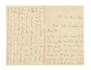 Lettre autographe signée de Marcel Proust à « mon cher confrère et maître », probablement Jean Ajalbert, qui avait écrit un article commentant l’attribution du prix Goncourt 1919 à Marcel Proust pour le 2ème volume de À la recherche du temps perdu.