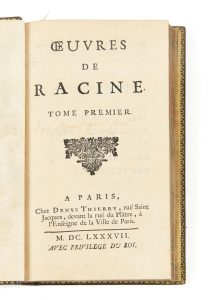 Jolie édition du XVIIe siècle des Œuvres de Racine, ornée de 6 gravures à l’eau-forte au premier volume et 7 au second.