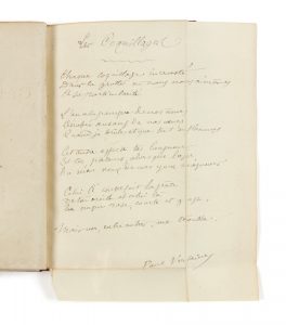 Édition originale de ce recueil de Paul Verlaine. Cet exemplaire est enrichi d’un poème autographe signé de 13 vers Les Coquillages (1 p. sur 1 f. in-8), présentant une variante avec le poème reproduit dans l’ouvrage.