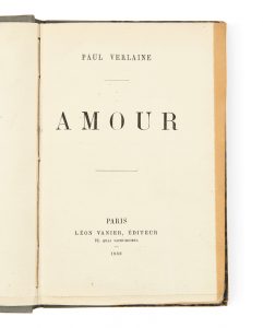 VERLAINE, Paul (1844-1896) — Amour — Paris, Léon Vanier, 1888 — In-12 (18,6 x 12,3 cm), bradel demi-percaline grise, pièce de titre au dos, couvertures conservées (reliure de l’époque).