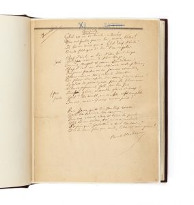 L’un des 71 exemplaires sur papier de Hollande (justifié et signé par Léon Vanier), enrichi d’un poème autographe signé : Conseils (le 11e poème de ce recueil, reproduit p. 25-26) ; 1 p. sur 1 f. in-8. Il est par ailleurs illustré de 9 aquarelles originales dont quatre représentent Verlaine, signées H. Thiriez dans un style Art nouveau.