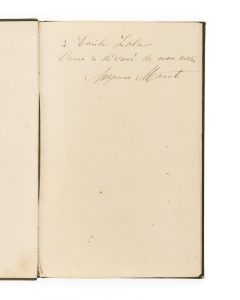 - ZOLA, Émile. Édouard Manet. Paris, Quantin, janvier 1884, reliure de l’époque de percaline verte. Exemplaire enrichi d’un envoi autographe signé de Suzanne Manet à Émile Zola : « l’ami si dévoué de mon mari. »