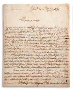 Importante lettre politique et militaire, un mois avant la bataille décisive de Carabobo, sur la libération prochaine du Venezuela et de la Colombie, et ses interrogations sur son propre rôle politique. Bolivar fait ici état des préparatifs qui se déroulent en vue de l’importante bataille de Carabobo, qui eut lieu un mois plus tard, le 24 juin 1821. C’est avec Bolivar à leur tête que les patriotes d’Amérique du Sud défirent les royalistes espagnols dans les plaines proches de Caracas, libérant ainsi pratiquement le Venezuela (intégré à la Grande Colombie) du joug espagnol. Le général Camilo LA TORRE commandait les Espagnols. C’est avec l’aide des volontaires anglais et irlandais que le général José Antonio PÁEZ et ses Llaneros (hommes des plaines) mirent en déroute l’aile droite des Espagnols tandis que la cavalerie des patriotes les écrasait en plein centre. Bolivar cite en outre deux personnalités importantes : Francisco Antonio ZEA (1766-1822), qui fut le suppléant de Bolivar au Congrès du Venezuela, et premier vice-président de la Grande Colombie ; et Francisco de Paula SANTANDER (1792-1840), qui succéda à Bolivar à la présidence de la Grande Colombie de 1819 à 1827. Il a reçu de très bonnes nouvelles : La Torre se dirige sur Caracas avec ses meilleures troupes, on dit que cela est dû à l’insurrection de la capitale. Le fait est qu’un événement très important l’a conduit là-bas parce que le rapprochement de BERMUDEZ ne suffit pas, l’armée de MORALES est en mesure de le repousser toute seule. Une lettre du Père d’Ospinos affirme que lorsque les troupes sont arrivées à Caracas, le Colonel Monagas est mort avec son bataillon de Valence, et que celui qui fait courir la nouvelle a vu à Valence ceux qui ont émigré de Caracas. Il fait également état de nombreuses autres choses incroyables. L’armée doit demain se diriger vers San Carlos afin d’éviter la destruction des patriotes de Caracas et du général Bermudez, qui doit déjà se trouver à proximité. Bolivar ne va pas attendre les troupes de Páez et Urdaneta, car cela pourrait être très dangereux. Les circonstances sont si favorables qu’il serait sans doute dommage de ne pas en profiter. Il a reçu le courrier d’Osorio avec de bien agréables nouvelles. Tout va bien en Europe, au sud, et ici. Si la chance ne se moque pas d’eux, la Colombie sera libre et reconnue cette année (« Si la fortuna no se burla descaradamente de nosotros Colombia sera libre y reconocida en este año »). Le bulletin d’information du Gouvernement n’est pas un vrai bulletin et n’émane d’ailleurs pas du gouvernement, mais du Congrès. Il ignore son auteur, mais son article les fait passer pour ridicules aux yeux de tous. Par le biais du journal des Cortes, les Espagnols, les derniers hommes à l’échelle de la civilisation (« los ultimos en la escala de la civilisacion »), ont donné un modèle. En ce qui concerne les affaires étrangères, la finance, la justice et l’intérieur, il avertit qu’il ne se mêlera de rien. S’il dit quelque chose, ce sera à titre de simple citoyen, ayant résolu de ne plus commander un État où tout va à l’encontre de ses sentiments et où même les hommes les plus instruits agissent comme le Sr Zea. Il est très ennuyé par tout ce qui est dit, pensé, écrit et fait. Il ne peut pas être citoyen de la Colombie, dont les lois ne me satisfont pas. Il a présenté un projet de constitution qui n’a pas été approuvé. Ce projet était la condition pour qu’il soit citoyen de Colombie. Comme ce projet n’a pas été adopté, Bolivar est certain qu’il n’y aura pas de stabilité politique et sociale ; en outre, ce même projet ne contient pas tout ce qui, à son avis, est nécessaire pour garantir leur existence. (« No puedo ser Ciudadano de Colombia con cuyas leyes no me conformo. He presentado un proyecto de Constitución que no se aprobó. Aquel proyecto era mi condición para ser ciudadano de Colombia. No habiéndose adoptado, estoy cierto de que no habrá estabilidad política ni social; y añado que aquel mismo proyecto no contiene todo lo que yo pienso que se requiere para asegurar nuestra existencia. »)