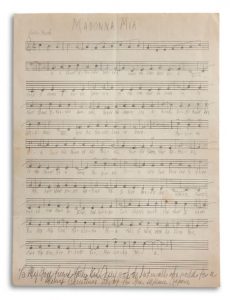 Sur une feuille de papier musique à 12 lignes, Al Capone a écrit au crayon 11 lignes de musique, avec les paroles en lettres capitales : « In a quaint Italian garden »… Dans un petit jardin italien vieillot, alors que les étoiles brillaient, on entendit un amoureux chanter à celle qu’il aimait […] Ma Madone, vous êtes la fl eur des roses, vous êtes le charme qui repose au cœur d’une chanson […] Madonna mia »…
