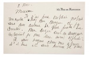CASSATT MARY (1844-1926). L.A.S. « Mary Cassatt », à un correspondant non-identifi é [Paris] 2 novembre ; 2 pages oblong in-12 à son adresse 10, Rue de Marignan ; en français.