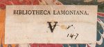 Provenance : Guillaume Chrétien de Lamoignon (1721-1794), numéros d’inventaire de bibliothèque en pied et sur les gardes [K80 barré, K91 et K70]. Sa vignette « Biblioteca Lamoniana » sur la contre-garde supérieure. Guillaume Chrétien Lamoignon de Malesherbes, était chancelier de France, botaniste et agronome, membre de l’Académie Royale des Sciences depuis 1750, l’adversaire de Buffon, le défenseur de l’Encyclopédie, ainsi qu’un fervent partisan de la cause révolutionnaire américaine. Son intérêt pour l’histoire naturelle de l’Amérique du Nord et en particulier pour la botanique le poussa à entamer une correspondance avec Thomas Jefferson, Benjamin Franklin, H. St. Jean de Crèvecoeur et François Barbe-Marbois. Il est décrit dans le Dictionary of Scientific Biography comme « l’un des plus éclairés des fonctionnaires de l’ancien régime » et un « porte-parole influent pour la liberté de la presse, la tolérance religieuse et la réforme fiscale ». A la fois libéral et empreint de principes moraux, le sens du devoir de Lamoignon fut la cause de sa mort : durant les bouleversements de 1792, il se porta volontaire pour assurer la défense de Louis XVI, une manifestation de fidélité qui se révéla être fatale puisque Lamoignon de Malesherbes périt sous la guillotine le 22 avril 1794 avec toute sa famille. Son impressionnante bibliothèque, d’où provient le présent ouvrage, fut dispersée par Jean-Luc Nyon en mai 1797.