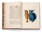 2 volumes grand in-folio, page-de-titre en rouge et noir, en anglais et en français, textes en anglais et français, carte double rehaussée de couleurs, 220 gravures coloriées à la main, dont 218 par Catesby d’après ses propres dessins, la plupart signées de son monogramme, et 2 par Georg Dionysius Ehret (planches 61 et 96 du t. II).