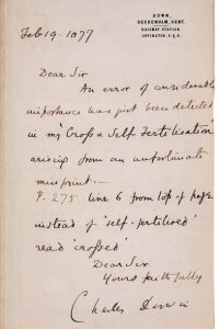 Pour encourager Reinwald, il indique que son éditeur a fait un tirage de 1500 exemplaires pour la première édition. 19 février 1877 (1 p. in-8), signalant une erreur d’importance considérable dans son Cross and Self Fertilisation…
