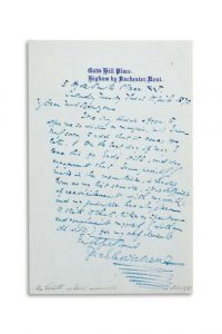 ; 1 page in-8 à l’encre bleue, en-tête Gad’s Hill Place ; en anglais (portrait gravé joint).