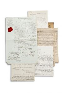 CAZOTTE DE LA CHASSAIGNE (commandant le corps d’artillerie à l’île d’Oléron, l.a.s., 1781) ; général Olivier HARTY (p.s., Quimper 1798, certificat d’infirmité pour le caporal Burel blessé dans un combat contre les Chouans à Argentré, et qui a fait les campagnes de 1780-1783 en Amérique dans l’armée de Rochambeau) ; longue et intéressante minute de lettre concernant l’exploitation de l’île de SAPELO (25 avril 1798) ; passeport maritime pour le brick américain « Fly » de Baltimore (1802, déchir.) ; William SAMPSON (l.a.s. à D.B. Warden, New York 1825) ; René GOBLET (l.a.s., 1888, concernant Panama) ; John Meredith READ (l.a.s., Paris 1896, au Dr Hamy ; plus une brochure impr. sur lui).