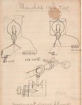 12 mars 1886. Dessin signé et légendé, représentant trois images complexes et distinctes : deux d’ampoules à incandescence de 50 et 150 volts, et une qui semble représenter un générateur contrôlé par la vapeur, avec cette légende : Presser des filaments de réglisse avec des extrémités élargies.