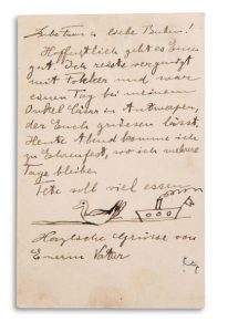 EINSTEIN ALBERT (1879-1955). L.A.S. « Vater » avec 2 DESSINS, [Breda 23 mars 1914], à sa femme Mileva EINSTEIN à Locarno (et leurs enfants) ; 1 page in-12, adresse au verso (carte postale) ; en allemand.