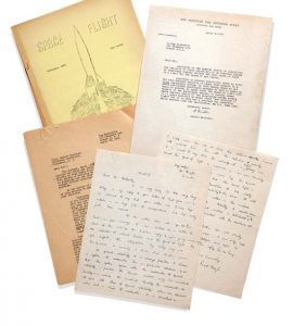 On joint : – le double carbone de la lettre dactylographiée de Sam MOSKOWITZ, 28 mars 1951 (2 p.), à Albert Einstein, l’interrogeant après la parution d’une étude de Fred Hoyle intitulée The Expanding Universe, formulant l’hypothèse que, dans le cadre de théorie de la relativité, un objet pourrait voyager à une vitesse supérieure à celle de la lumière ; – une longue l.a.s. de l’astronome britannique Fred HOYLE (1915-2001) à Moskowitz, 27 mars [1952] (3 p. in-4), expliquant ses hypothèses, et commentant la lettre d’Einstein ; – 2 brochures ronéotées de Gerry de LA REE : Space Flight When ?... « Featuring the results of the 1946 Beowulf Poll » (1 f-7 p. in-4), et Space Flight (février 1947, 1 f-9 p.).
