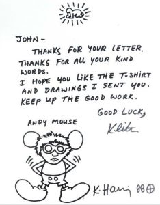 En tête de la lettre, figure un petit radiant baby (bébé radieux), signature iconique de l’artiste, et en bas, un grand Andy Mouse (souris Andy) : un Andy WARHOL transformé en Mickey