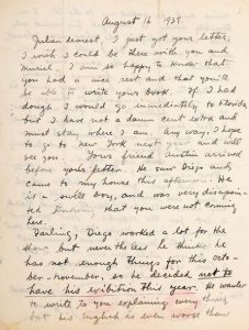 Si elle avait de l’argent, elle viendrait tout de suite en Floride, mais elle n’a pas un sou et doit rester où elle est. Diego [RIVERA] avait beaucoup travaillé pour l’exposition mais il pense néanmoins ne pas avoir assez de matériel pour cet octobre-novembre. Il a donc décidé de ne pas avoir son exposition cette année. Il voulait écrire à Levy pour lui expliquer tout ça mais son anglais est encore pire que celui de Frida. Elle est terriblement désolée qu’il ait changé d’avis trois mois seulement avant l’ouverture de l’exposition, ce qui va poser des problèmes à Julien, mais elle sait en même temps qu’il a raison, car il souhaitait vraiment organiser une grande exposition, et il n’a que peu de choses importantes. Il vaut donc mieux attendre l’an prochain. Et elle termine par des baisers au rouge à lèvres pour Julien et Muriel…