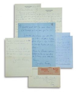 Très belle correspondance avec André Malraux, communiant dans l’amour de l’art. Washington 27 juin 1962, remerciant Malraux qui a off ert aux Kennedy une statue khmer, déballée dans la nuit : « cet être mysterieuse était là, devant nous. Personne ne pouvait dire un mot – Elle a une étrange lumière – même dans le noir. […] Tout autour d’elle me semble vulgaire et aff ecté. [...] quand on a le beau – on a horreur du joli. […] je n’ai pas le vocabulaire en français pour vous dire combien je l’adore. Je prendrais des phrases des Voix du Silence – mais si l’auteur les reconnaissait ! »...