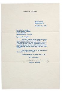 KENNEDY JOSEPH PATRICK (1888-1969). Père du Président J.F. Kennedy L.S. « Joseph P. Kennedy », Hyannis Port (Massachusetts) 30 novembre 1956