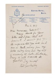 KIPLING RUDYARD (1865-1936). L.A.S. « Rudyard Kipling », Bath 2 mars 1917, à Louis FABULET ; 1 page in-8, en-tête Empire Hotel, Bath ; en anglais