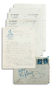 ; 1 page in-8 à vignette et en-tête Hôtel Meurice, et 7 pages et demie in-8 à en-tête Le Temps, enveloppe autographe ; en français.