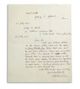 LAWRENCE DAVID HERBERT (1885-1930). L.A.S. « D.H. Lawrence », Kesselmatte, Gsteig b. Gstaad (Bern) 28 juillet 1928, à Allen W. STEELE, chez William Jackson Ltd., à Londres ; 1 page in-4 ; en anglais.
