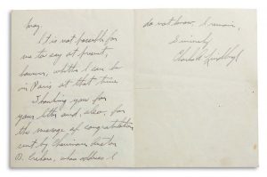 LINDBERGH CHARLES (1902-1974). Aviateur et officier américain. L.A.S. « Charles A. Lindbergh », [1928 ?], à Mr. HOSKIER ; 2 pages et quart in-8, vignette et en-tête Legation of the United States of America ; en anglais