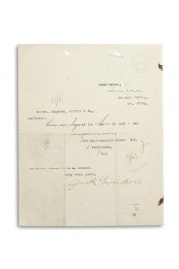 LONDON JACK (1876-1916). L.S. « Jack London », Oakland (Californie) 27 octobre 1900, à ses éditeurs Houghton, Mifflin & Co.; ¾ page dactylographiée in-4 (trous de classeur, cachet de réception) ; en anglais.