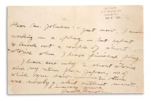 LONDON JACK (1876-1916) L.A.S. « Jack London », Oakland (Californie) 2 novembre 1904, à Mr. JOHNSTON ; 1 page oblong in-8 avec son cachet encre (fendue au pli central et réparée) ; en anglais.
