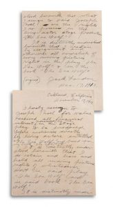 Sur un feuillet à part, Jack London rédige une mise au point sur ses droits d’auteur. Pour valeur reçue, il abandonne à Joseph Noel tout intérêt pécuniaire dans la pièce de théâtre destinée à être représentée devant le public par des acteurs vivants, intitulée Le Loup des mers, et fondé sur son livre intitulé Le Loup des mers. Il est expressément entendu que London retient et détient tous droits cinématographiques quelconques dans ladite pièce Le Loup des mers et dans ledit livre, Le Loup des mers. Il est expressément entendu qu’il abandonne à Joseph Noel ses droits dans la production scénique du Loup des mers avec des acteurs vivants. Il est expressément entendu qu’il retient par tous les moyens toute propriété de tous droits cinématographiques pour la pièce Le Loup des mers et pour le livre Le Loup des mers … Une petite note jointe précise qu’il faut taper tout ça avec double carbone.