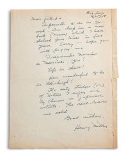 MILLER HENRY (1891-1980). L.A.S. « Henry Miller », Big Sur (Califonie) 9 septembre 1958, au peintre Michel MOY ; 1 page in-4 (petite fente) ; en anglais.