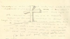 Au verso du f. 7, Saint Exupéry a dessiné au crayon noir une grande croix fichée en terre accompagnée de la mention : « j’ai bien mal quand même vois-tu ! ».
