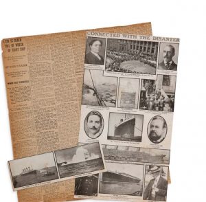 Réunion de coupures de journaux ou magazines anglais et américains de l’époque sur le naufrage du Titanic et les principaux protagonistes.