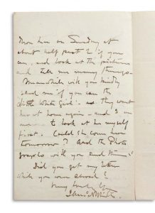 Il a reçu sa lettre ce matin seulement, car Deschamps avait oublié d’indiquer Chelsea. Il regrette de n’avoir pu assister à la soirée de samedi, et veut voir Deschamps pour avoir des nouvelles de Paris et de certaines personnes de leur connaissance. Il pourrait venir dimanche et regarder les peintures. Il le prie de lui renvoyer la Little White Girl, car les collectionneurs voudraient l’avoir à nouveau chez eux, et Whistler voudrait le voir d’abord…