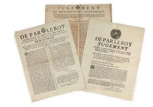[AFFICHES]. Ensemble 3 affiches du XVIIIe siècle. Placards imprimés, 45 x 35 cm ; 52 x 42 cm. PRECIEUX ENSEMBLE DE TROIS AFFICHES IMPRIMEES DU XVIIIe siècle, ANNONfANT DES SENTENCES JUDICIAIRES, PUBLIEES EN 1725 ET 1755. On y trouve : la...