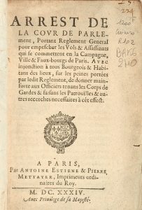Arrest de la cour de Parlement, portant reglement general pour empescher les vols & assassinats qui se commettent en la campagne, ville & faux-bourgs de Paris. Avec injonction à tous bourgeois & habitans des lieux, sur les peines portées par ledit...