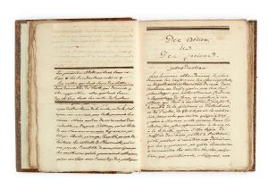 défauts aux coiffes ; quelques petites trous et galeries de vers à l'intérieur). TRADUCTION FRANCAISE INEDITE DU CELEBRE TRAITE DE BECCARIA, D'APRES LA CINQUIEME EDITION, DEFINITIVE, PARUE EN MARS 1766 A LIVOURNE SOUS LA FAUSSE ADRESSE DE LAUSANNE. Il ne s'agit pas d'une copie de la traduction de l'abbé Morellet. ffiuvre d'un auteur inconnu, la présente traduction est, selon Philippe Audegean, "très intéressante : littérale, précise, très respectueuse du texte italien (contrairement à celle de l'abbé Morellet, parue en 1766)”. Le manuscrit présente quelques lignes oblitérées et de rares corrections à une quinzaine de pages ; c'est le manuscrit autographe du traducteur, hélas non identifié. La traduction du traité est précédée des textes suivants : - "Jugement d'un livre intitulé : Des délits, et des peinespar un ; traduction du "Giudizio di celebre professore..” ,celebre professeur d'Italie” qui accompagna la "3e” édition, et qui est dü à Alberto Giovanni de Soria, professeur à Pise (16 pages) ; - une épitre dédicatoire en italien, signée "C. D ”, datée de "D.”, 27 février 1767, à son frère Michel ..., conseiller du Roi de France et avocat au bailliage de .. La traduction du traité Des Délits et des peines comprend : l'avis "Au lecteur” (paginé [5]-11), suivi d'une note sur les signes indiquant les additions et notes de l'auteur ; puis le traité lui-même, précédé de l'Introduction, avec ses 47 paragraphes (paginé 9-200) ; la table des matières. Citons le début de l'introduction : "Les hommes abbandonnent le plus souvent les reglemens les plus importants, au hazard, ou à la discrétion de ceux dont l'intérest est de s'opposer aux loix les plus sages, qui, naturellement, tendent à l'avantage de tous, et résistent à cet effort qui tend à concentrer, d'une part, le comble de la puissance et du bonheur, et de l'autre, la foiblesse et la misère. C'est pour cela, que ce n'est qu'après être passés à travers mille erreurs dans les choses les plus essencielles à la vie, et à la liberté, après s'être lassés de souffrir des maux portés à l'extrême, qu'ils pensent à remédier aux désordres qui les oppriment, et qu'ils commencent à reconnoitre les vérités les plus palpables, qui, précisément, échappent aux esprits vulgaires, à cause de leur simplicité”... Cachets de la collection A.A. Beaujour à Caen.