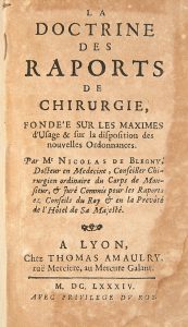 BLÉGNY (Nicolas de). La Doctrine des raports [sic] de chirurgie, fondée sur les maximes d'usage & sur la disposition des nouvelles ordonnances. Lyon, Thomas Amaulry, 1684. In-12, basane brune, dos à nerfs orné (reliure de l'époque). naie de cet...