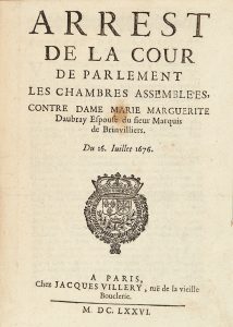 [BRINVILLIERS]. Arrest de la cour de Parlement les Chambres assemblées, contre Dame Marie Marguerite Daubray, espouse du sieur Marquis de Brinvilliers. Du 16 juillet 1676. Paris, Jacques Villery, 1676. Suivi de : - Factum, pour Dame Marie...