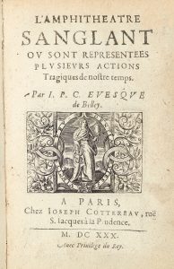 CAMUS (Jean-Pierre). L'Amphitheatre sanglant ou sont representees plusieurs actions tragiques de nostre temps. Paris, Joseph Cottereau, 1630. In-8, vélin de l'époque. Édition originale. RECUEIL de 35 RECITS CRIMINELS TENUS pour AUTHENTIQUES, mis...