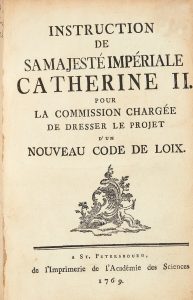 CATHERINE II DE RUSSIE. Instruction de S.M. impériale Catherine II pour la Commission chargée de dresser le projet d'un nouveau code de Loix. Saint-Pétersbourg, Imprimerie de l'Académie des Sciences, 1769. In-8 de (1) f. de titre, 172 pp., (2)...