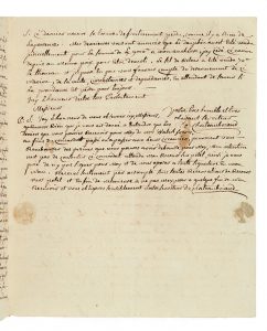 pages et demie in-4, adresse avec marque postale. AU SUJET DE SES NAVIRES POUR LA TRAITE. [Après avoir navigué aux ïles et armé des corsaires durant la Guerre de Sept Ans, Chateaubriand trafiquait alors par mer toutes sortes de marchandises. Deux de ses navires évoqués ici, le Jean-Baptiste (du nom de son fils ainé) et l'AimableJulie (sa fille), assuraient les liaisons de la traite négrière entre la Guinée et Saint-Domingue.] Il vient de recevoir leur courrier par lequel il apprend qu'ils ont fait assurer "a tous risques, sans stipulation dogmantation de prime en cas de guerre, les 2400 **, à 8 pr % comptant de prime, sur les marchandises chargés ou à charger, pour compte de Mr navet, au Cap franfois sur le navire L'AimableJulie de St Malo”, qui doit repartir pour Saint-Domingue dans le mois. Il apprend également que les Frères Roux ont commencé à le faire assurer pour son navire le Jean Baptiste, actuellement aux Cayes St Louis, "pour jusquau port de France dans locean ou il fera la decharge, au mesmes conditions et prime que celle accordée sur marchandise dans laimable Julie, en me garantissant la solvabilité de mes assureurs moienant un pour cent, mais que vous ne vous chargés de me faire assurer, tout au plus, que 30000 livres sur ce navire, dit le Jean Baptiste", alors qu'ils n'ont pu "me faire assurer sur le St René en Guinnée”... Il les remercie du soin qu'ils ont pris pour lui procurer ces assurances et se félicite en revanche de n'avoir pu assurer le Saint René, "comptant que ce navire est actuellement en route de Guinée pour St Domingue ou jespere quil se rendera en paix, dautant plus que je commance a croire que la guerre n'aura pas lieu”. Il discute les modalités de paiement des primes d'assurance, et se refuse à un concordat avec les frères Walsh (armateurs en faillite), évoquant "la perte sur le dernier voiage des terreneuviens le Dauphin et la Providance, si ce dernier navire se trouve definitivement perdu, comme il y a bien de laparance”... Il avait acheté le Dauphin pour une enchère de 9000 livres et l'a ensuite cédé au même prix pour démolition : "le sel de retour a esté vendu 70 livres le thoneau et jespere en peu vous fournir compte du desarmement de ce navire, de la vente, circonstances et dependances, en attendant de savoir si la Providance est perdu pour toujours”... Etc.