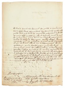 DE CINQ-MARS. * Lettre du lieutenant-général LE FAY de la TROUSSE, du camp près de Corbie 10 aoüt 1642, au cardinal de Richelieu. Pendant l'instruction du procès de Cinq-Mars, il intervient en faveur de son beau-frère le marquis de FlAMARENS, soupfonné d'avoir participé au complot, et dont il proclame l'innocence, "ensorte que lhabitude quil a eue avec des criminels ne luy soit point imputée à crime. (...) Navoir jamais cognu monsr le grand [Cinq-Mars] que par loccasion du siege de Perpignan, sestre esloigné de luy plus de trois semaines devant sa prise à Narbonne, avoir esté dans ses maisons six semaines apres cette prise lors que tous les coupables prenoient la fuitte et avoir esté arresté en allant trever monsr le maral de Schomberg pour servir au siege de Perpignan contre le secours d'Espagne, semble dassez bonnes marques quil na point eu de part en la conspiration"... * Recit veritable de ce qui cest passé au proces & en la mort de monsieur le Grand & de Thou. Une note marginale de la fin du XVIIIe siècle par un certain Percheron indique que ce récit proviendrait "d'un registre du Bureau des finances de la généralité d'Orléans, et recouvré en 1794 au mois de mars lorsqu'on brulait sur la place du Martroy, les papiers qu'on avait enlevé des différens dépöts". La relation commence par la confession générale de GASTON d'ORLEANS le duc de ,denonfant ses complices bouillon, CinQ-MARS, de THOU, le traité avec l'Espagne : "Le traité fut apporté par FONTRAILLE au mois de mars à Mr le Grand qui l'envoya à Monsieur frere du Roy (...). Monsr le rompit aussytost qu'il eust appris que Mr le Grand avoit esté arresté et néanmoings en retint une coppie laquelle il a représentée & contresignée de luy & du secrétaire de ses commendements". Le document raconte l'interrogatoire du duc de Bouillon et poursuit : "Pour Mr de Thou il estoit chargé par Mr de luy avoir dict qu'il sfavoit la trahison avec Mr de Bouillon (...) & de plus d'avoir parlé à M. le duc de Beaufort pour le gaingner au parti & d'avoir raporté à Mr de l'avoir trouvé froit". Ce manuscrit explique que les charges contre de Thou étaient peu importantes : "Plusieurs estoient disposés à ne le condamner pas sur ces preuves, mais il arrive que M. le Grand estant ouy sur la selette dict que M. de Thou avait sceu le traitté d'Espagne (...) Ledict S. de Thou au lieu de se tenir en sa negation accorda quil avoit eu cognoisance du traitté par Fontraille à Tarascon, qu'il lavoit blasmé & ne l'avoit descouvert crainte d'estre opprimé par les 3 complices"... De Thou répond qu'il préfère encore mourir que de finir ses jours en prison ou de subir la question ; Cinq-Mars et de Thou sont condamnés à mort. "Mr le Grand ayant ouy son arrest de mort fust mis entre les mains de son faiseur, après quoy lon prononfa à Mr de Thou le sien"... Ils sont menés place des Terreaux. Le manuscrit rapporte les derniers propos de Cinq-Mars et de Thou... "L'execution de Mr le Grand estant faicte Mr de Thou sortit du carosse qui avoit esté fermé pendant lexecution de Mr le Grand & montant hardiement & viste sur leschaffault comme il apperceut le corps de Mr le Grand, il ouvrit les bras & leva les yeux au ciel, ayant mis son manteau au pied du corps, il fust embrasser le bourreau (...) Il mit le col sur le poteau & receut six [coups] devant que la teste fust séparée, mais lon croit quil mourut du premier. Les deux corps furent mis dans le carosse qui les avoit conduit au supplice & portés dans l'église des freres feillans"... Ancienne collection Marcel PLANTEVIGNES (Versailles, 21 décembre 1976, n° 144).